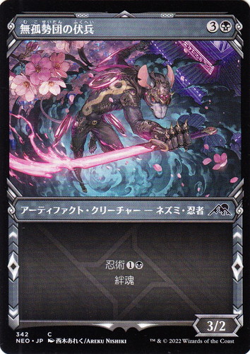 ![]() ![]() | NEO 342 無狐勢団の伏兵 アーティファクト・クリーチャー 神河:輝ける世界 C 色:黒 サブタイプ:ネズミ・忍者 マナコスト:(3)(黒) パワー:3 タフネス:2 忍術(1)(黒) 絆魂 illust:西木あれく/AREKU NISHIKI |