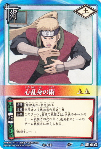 ![]() ![]() | 術-160 心乱身の術 術 巻ノ八 強襲!木ノ葉崩し編 シンボル:土 コスト:土土 【条件】「精神属性+中忍」以上 【目標】使用者と交戦中の忍者1枚 【効果】このターン、目標の戦闘力は、本来のチームのチーム戦闘力の代わりに、使用者のチームのチーム戦闘力に加えられる。 「体が勝手に・・・!!」 |