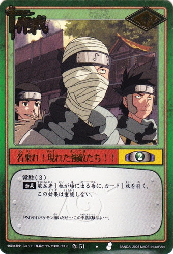 ![]() ![]() | 作-63 新人9人全員集合 作戦 ※確認中1 シンボル:火 コスト:2 【効果】このターン、通常の配備に加えて、さらに忍者1枚を配備できる。この効果は、通常の忍者の配備を行った後、自分の忍者が相手の忍者より、少ない場合のみ適用できる。 「今年の新人下忍9名、全員受験って訳か」 |