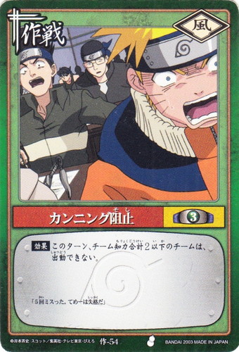 ![]() ![]() | 作-54 カンニング阻止 作戦 巻ノ参 挑戦者集結!編 シンボル:風 コスト:3 【効果】このターン、チーム知力合計2以下のチームは、出動できない。 「5回ミスった。てめーは失格だ」 |