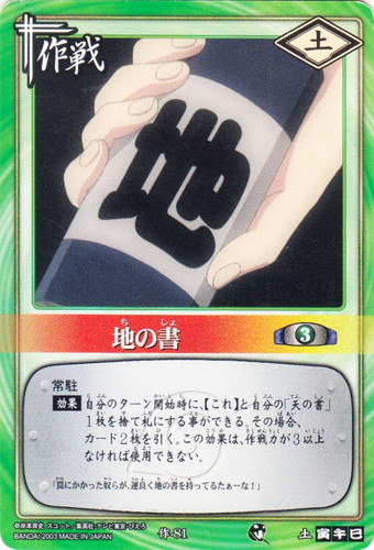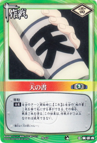 ![]() ![]() | 作-67 天の書 作戦 巻ノ四 死の森の試験!編 シンボル:雷 コスト:3 常駐 【効果】自分のターン開始時に、【これ】と自分の「地の書」1枚を捨て札にする事ができる。その場合、戦果2枚を得る。この効果は、作戦力が3以上なければ使用できない。 「都合よく天の書じゃん・・・」 |