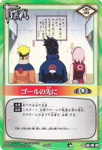 ![]() ![]() | 作-68 ゴールの先に 作戦 巻ノ四 死の森の試験!編 シンボル:雷 コスト:0 【目標】全ての自分の忍者 【効果】このターン、目標のチームが戦果を得た場合、そのチームの全ての忍者を「治療」する。 「天無くば知を識り機に備え、地無くば野を駆け利を求めん―――」 |