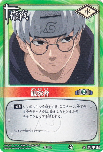 ![]() ![]() | 作-75 観察者 作戦 巻ノ四 死の森の試験!編 シンボル:水 コスト:2 【効果】シンボル1つを指定する。このターン、全ての自分のチャクラは、指定したシンボルのチャクラとしても扱われる。 「コイツ・・・何か引っかかる・・・・・・」 |