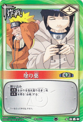 ![]() ![]() | 作-102 塗り薬 作戦 巻ノ五 実力伯仲!予選死闘編 シンボル:土 コスト:2 割り込み 【目標】自分の負傷状態の忍者1枚 【効果】目標を「治療」する。 「・・・もらってやりな、ナルト」 |