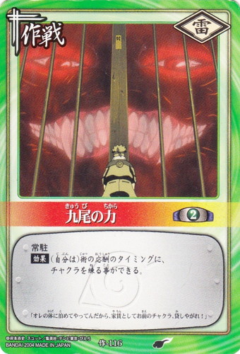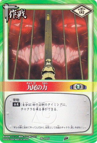 ![]() ![]() | 作-116 九尾の力 作戦 巻ノ八 強襲!木ノ葉崩し編 シンボル:雷 コスト:2 常駐 【効果】(自分は)術の応酬のタイミングに、チャクラを練る事ができる。 「オレの体に泊めてやってんだから、家賃としてお前のチャクラ、貸しやがれ!」 |