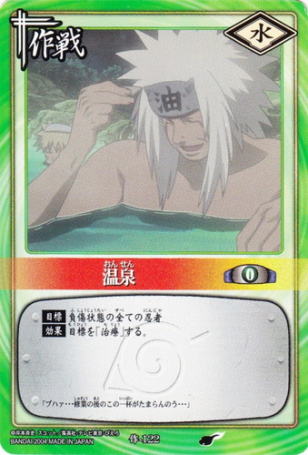 ![]() ![]() | 作-122 温泉 作戦 巻ノ六 それぞれの試験!編 シンボル:水 コスト:0 【目標】負傷状態の全ての忍者 【効果】目標を「治療」する。 「プハァ・・・修行の後のこの一杯がたまらんのう・・・」 |
