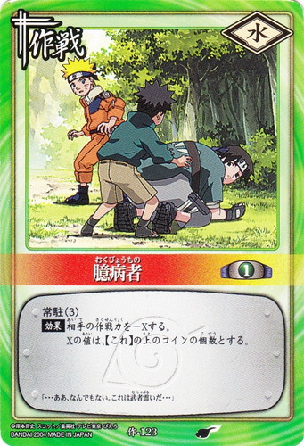 ![]() ![]() | 作-123 臆病者 作戦 巻ノ六 それぞれの試験!編 シンボル:水 コスト:1 常駐(3) 【効果】相手の作戦力を-Xする。 Xの値は、【これ】の上のコインの個数とする。 「・・・ああ、なんでもない。これは武者震いだ・・・」 |