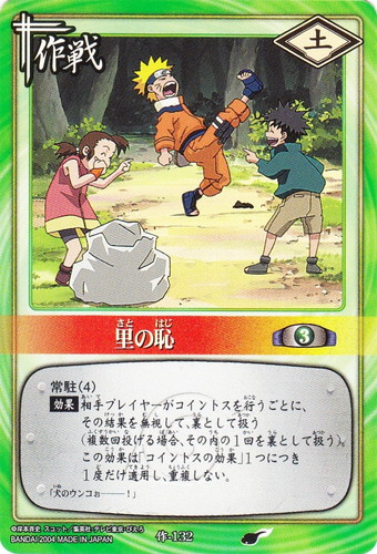 ![]() ![]() | 作-216 説教 作戦 ※確認中1 シンボル:火 コスト:3 【目標】敵の「下忍」1枚 【効果】目標を好きな敵のチームに組み込む。 「サスケ。復讐なんてやめとけ」 |