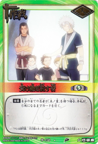 ![]() ![]() | 作-158 受け継ぎ託す者 作戦 巻ノ八 強襲!木ノ葉崩し編 R シンボル:火 コスト:5 【効果】自分の全ての忍者が「木ノ葉」を持つ場合、手札が6枚になるまでカードを引く。 「ワシは初代様、二代目様の木ノ葉の意志を受け継いだ男、三代目火影じゃ!!!」 |