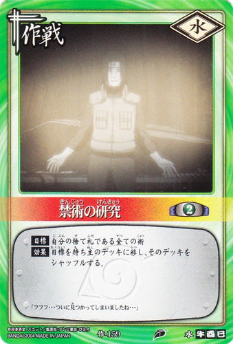 ![]() ![]() | 作-159 禁術の研究 作戦 巻ノ八 強襲!木ノ葉崩し編 シンボル:水 コスト:2 【目標】自分の捨て札である全ての術 【効果】目標を持ち主のデッキに移し、そのデッキをシャッフルする。 「フフフ・・・ついに見つかってしまいましたね・・・」 |