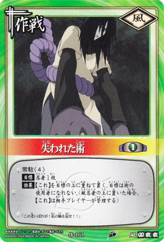 ![]() ![]() | 作-161 失われた術 作戦 巻ノ八 強襲!木ノ葉崩し編 シンボル:風 コスト:1 常駐(4) 【目標】忍者1枚 【効果】【これ】を目標の上に重ねて置く。目標は術の使用者になれない。(敵忍者の上に置いた場合、【これ】は相手プレイヤーが管理する) 「この老いぼれが!私の腕を返せ!!」 |