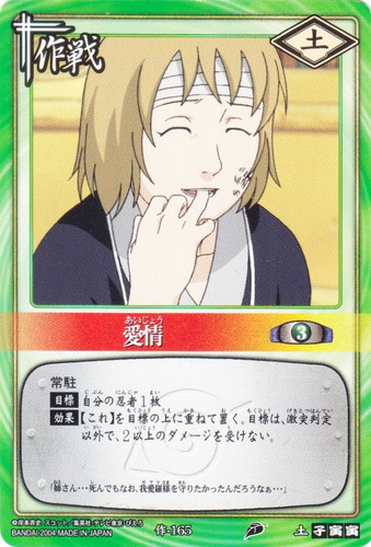 ![]() ![]() | 作-165 愛情 作戦 巻ノ八 強襲!木ノ葉崩し編 シンボル:土 コスト:3 常駐 【目標】自分の忍者1枚 【効果】【これ】を目標の上に重ねて置く。目標は、激突判定以外で、2以上のダメージを受けない。 「姉さん・・・死んでもなお、我愛羅様を守りたかったんだろうなぁ・・・」 |