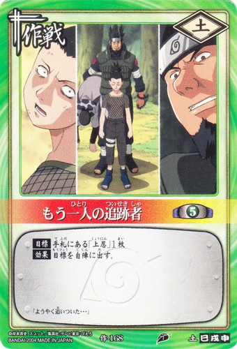 ![]() ![]() | 作-168 もう一人の追跡者 作戦 巻ノ八 強襲!木ノ葉崩し編 シンボル:土 コスト:5 【目標】手札にある「上忍」1枚 【効果】目標を自陣に出す。 「ようやく追いついた・・・」 |