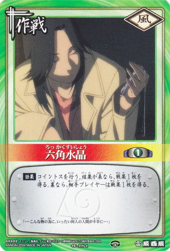 ![]() ![]() | 作-184 六角水晶 作戦 巻ノ九 暁の凶星編 シンボル:風 コスト:1 【効果】コイントスを行う。結果が表なら、戦果1枚を得る。裏なら、相手プレイヤーは戦果1枚を得る。 「・・・こんな物の為に、いったい何人の人間が不幸に・・・」 |