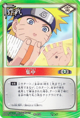 ![]() ![]() | 作-116 九尾の力 作戦 巻ノ六 それぞれの試験!編 シンボル:雷 コスト:2 常駐 【効果】(自分は)術の応酬タイミングに、チャクラを練る事ができる。 「オレの体に泊めてやってんだから、家賃としてお前のチャクラ、貸しやがれ!」 |