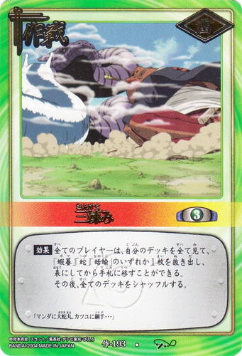 ![]() ![]() | 作-193 三竦み 作戦 巻ノ十 受け継ぎ託すもの編 R シンボル:雷 コスト:3 【効果】全てのプレイヤーは、自分のデッキを全て見て、「蝦蟇」「蛇」「蛞蝓」のいずれか1枚を抜き出し、表にしてから手札に移すことができる。その後、全てのデッキをシャッフルする。 「マンダに大蛇丸、カツユに綱手・・・」 |