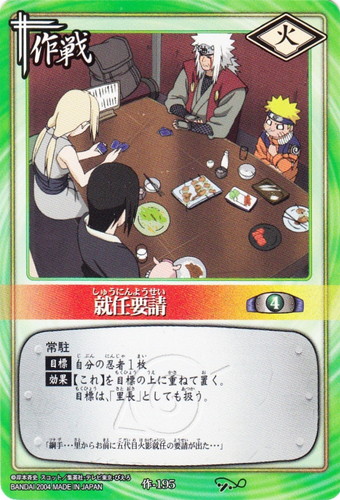 ![]() ![]() | 作-195 就任要請 作戦 巻ノ十 受け継ぎ託すもの編 シンボル:火 コスト:4 常駐 【目標】自分の忍者1枚 【効果】【これ】を目標の上に重ねて置く。目標は「里長」としても扱う。 「綱手・・・里からお前に五代目火影就任の要請が出た・・・」 |