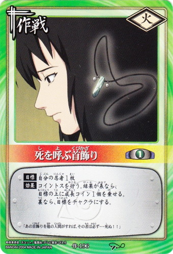 ![]() ![]() | 作-196 死を呼ぶ首飾り 作戦 巻ノ十 受け継ぎ託すもの編 シンボル:火 コスト:1 【目標】自分の忍者1枚 【効果】コイントスを行う。結果が表なら、目標の上に成長コイン1個を乗せる。裏なら、目標をチャクラにする。 「あの首飾りを他の人間がすれば、その者は必ず・・・死ぬ!!」 |