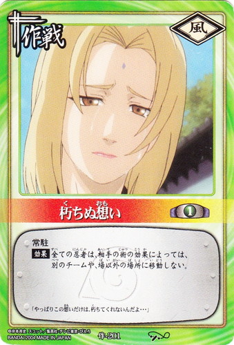 ![]() ![]() | 作-201 朽ちぬ想い 作戦 巻ノ十 受け継ぎ託すもの編 シンボル:風 コスト:1 常駐 【効果】全ての忍者は、相手の術の効果によっては、別のチームや、場以外の場所に移動しない。 「やっぱりこの想いだけは、朽ちてくれないんだよ・・・」 |
