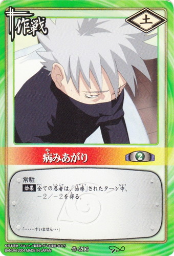 ![]() ![]() | 作-206 病みあがり 作戦 巻ノ十 受け継ぎ託すもの編 シンボル:土 コスト:2 常駐 【効果】全ての忍者は、「治療」されたターン中、-2/-2を得る。 「・・・・・・すいません・・・」 |
