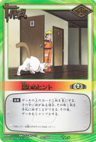 ![]() ![]() | PR作-21 それぞれの思惑 作戦 プロモーションカード シンボル:雷 コスト:2 【効果】全てのプレイヤーは、デッキの上のカード3枚を見て、その中にあるカード1枚を手札に移すことができる。その後、残りのカードを好きな順番で元のデッキの下に移す。 「オレはお前を・・・大蛇丸なんかに取られたくねーんだってばよ・・・」 |