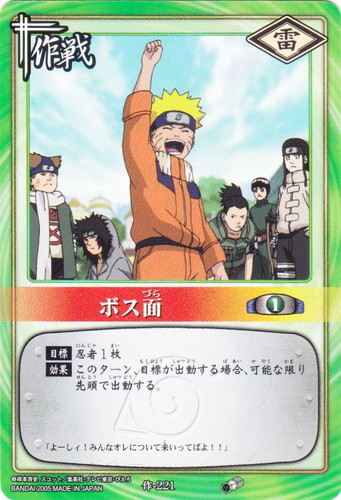 ![]() ![]() | 作-221 ボス面 作戦 巻ノ十一 結成!木ノ葉小隊編 シンボル:雷 コスト:1 【目標】忍者1枚 【効果】このターン、目標が出動する場合、可能な限り先頭で出動する。 「よーしィ!みんなオレについて来いってばよ!!」 |