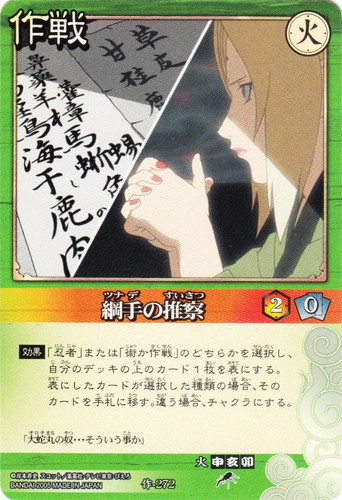 ![]() ![]() | 作-272 綱手の推察 作戦 巻ノ十四 豪華絢爛!忍大結集編 シンボル:火 コスト:2 手札コスト:0 【効果】「忍者」または「術か作戦」のどちらかを選択し、自分のデッキの上のカード1枚を表にする。表にしたカードが選択した種類の場合、そのカードを手札に移す。違う場合、チャクラにする。 「大蛇丸の奴・・・そういう事か」 |