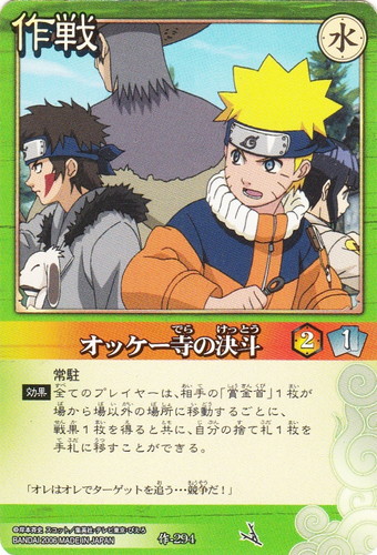 ![]() ![]() | 作-26 意外性No.1 作戦 ※確認中1 シンボル:雷 コスト:3 割り込み 【目標】敵の忍者1枚 【効果】このターン、目標は可能な限り、出動しなければならない。 「はいはい・・・うずまきナルトさんね」 |