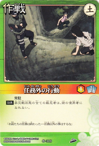 ![]() ![]() | 作-318 任務外の行動 作戦 巻ノ十六 火の継承者 編 シンボル:土 コスト:1 手札コスト:1 常駐 【効果】非交戦状態の全ての敵忍者は、術の使用者になれない。 「お前たちの任務は終わった・・・任務以外の事はするな」 |