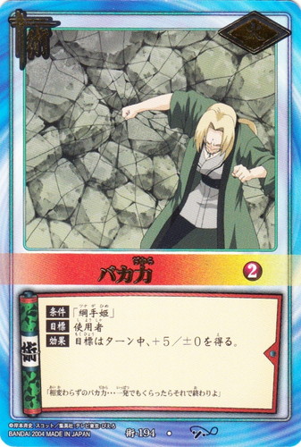 ![]() ![]() | 術-194 バカ力 術 巻ノ十 受け継ぎ託すもの編 R シンボル:火 コスト:2 【条件】「綱手姫」 【目標】使用者 【効果】目標はターン中、+5/±0を得る。 「相変わらずのバカ力・・・一発でもくらったらそれで終わりよ」 |