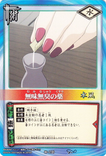 ![]() ![]() | 術-198 無味無臭の薬 術 巻ノ十 受け継ぎ託すもの編 シンボル:水 コスト:水風 【条件】「綱手姫」 【目標】未出動の忍者1枚 【効果】目標の上に毒コイン1個を乗せる。毒コインが上にある忍者は、出動できない。 「忍者を対象に無味無臭の薬を調合出来んのはアイツくらいだ」 |