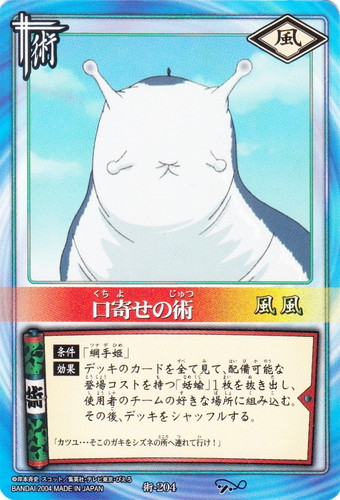 ![]() ![]() | 術-204 口寄せの術 術 巻ノ十 受け継ぎ託すもの編 シンボル:風 コスト:風風 【条件】「綱手姫」 【効果】デッキのカードを全て見て、配備可能な登場コストを持つ「蛞蝓」1枚を抜き出し、使用者のチームの好きな場所に組み込む。その後、デッキをシャッフルする。 「カツユ・・・そこのガキをシズネの所へ連れて行け!」 |