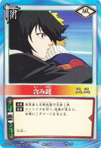 ![]() ![]() | 術-200 含み針 術 巻ノ十 受け継ぎ託すもの編 シンボル:風 コスト:風風 【目標】使用者と交戦状態の忍者1枚 【効果】コイントスを行う。結果が表なら、目標に1ダメージを与える。 「含み針!」 |
