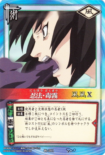 ![]() ![]() | 術-201 忍法・毒霧 術 巻ノ十 受け継ぎ託すもの編 シンボル:風 コスト:風風X 【目標】使用者と交戦中の忍者X枚 【効果】目標1枚につき、コイントスを2回行う。結果が2回とも表になった忍者を捨て札にする。術コストのXは「風」のシンボルを持つチャクラでしか支払えない。 「ひと吸いでもすればヤバイ・・・・・・」 |