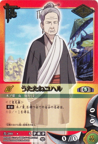 ![]() ![]() | 忍-200 うたたねコハル 忍 巻ノ九 暁の凶星編 R シンボル:土 コスト:5 戦闘力:0 支援力:0 負傷戦闘力:0 負傷支援力:0 知力:2 特徴:木ノ葉/女 《ご意見番》 【有効】「木ノ葉」を持つ全ての自分の忍者は、±0/+1を得る。 「信頼のおける強い指導者が要る」 |