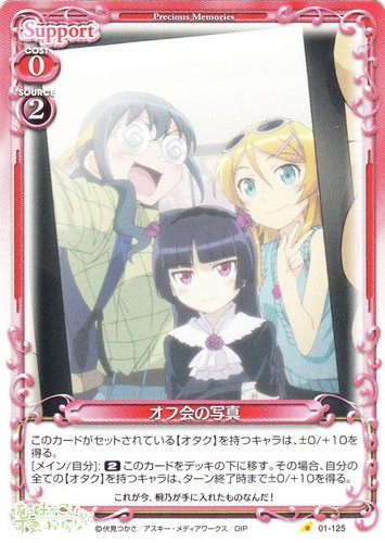![]() ![]() | 01-125 オフ会の写真 Support 俺の妹がこんなに可愛いわけがない ブースターパック C(foil) 色:赤 使用コスト:0 発生コスト:2 このカードがセットされている【オタク】を持つキャラは、±0/+10を得る。 [メイン/自分]:[2]このカードをデッキの下に移す。その場合、自分の全ての【オタク】を持つキャラは、ターン終了時まで±0/+10を得る。 これが今、桐乃が手に入れたものなんだ! 作品名:俺の妹がこんなに可愛いわけがない |