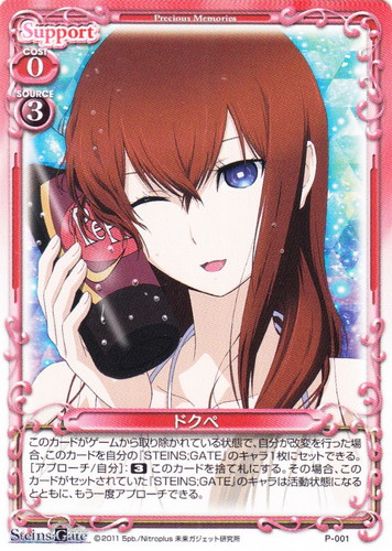 ![]() ![]() | P-001 ドクペ Support STEINS;GATE プロモーションカード 色:赤 使用コスト:0 発生コスト:3 このカードがゲームから取り除かれている状態で、自分が改変を行った場合、このカードを自分の「STEINS;GATE」のキャラ1体にセットできる。 [アプローチ/自分]:[3]このカードを捨て札にする。その場合、このカードがセットされていた「STEINS;GATE」のキャラは活動状態になるとともに、もう一度アプローチできる。 作品名:STEINS;GATE |