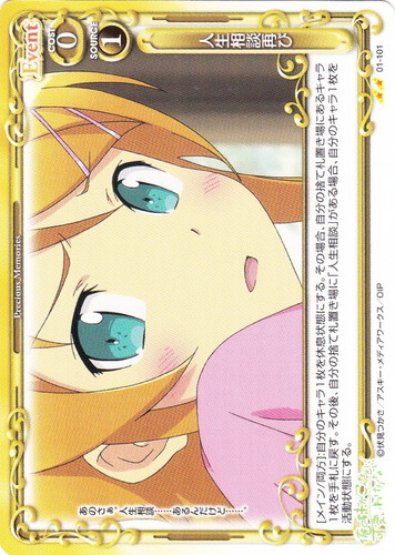![]() ![]() | 01-101 人生相談再び Event 俺の妹がこんなに可愛いわけがない ブースターパック U 色:黄 使用コスト:0 発生コスト:1 [メイン/両方]:自分のキャラ1枚を休息状態にする。その場合、自分の捨て札置き場にあるキャラ1枚を手札に戻す。その後、自分の捨て札置き場に「人生相談」がある場合、自分のキャラ1枚を活動状態にする。 あのさぁ。人生相談・・・・・・あるんだけど・・・・・・。 作品名:俺の妹がこんなに可愛いわけがない |