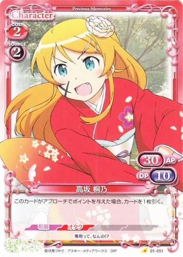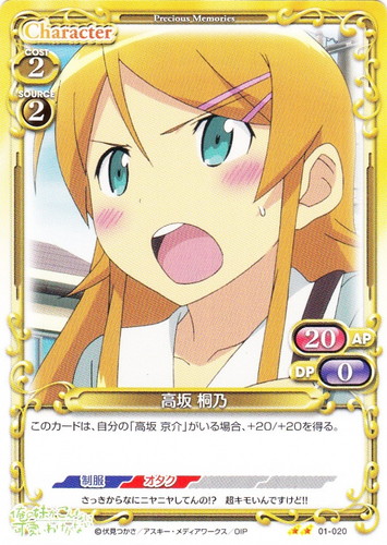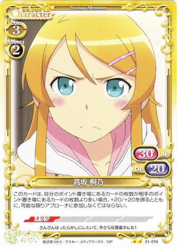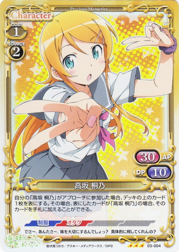 ![]() ![]() | P-001 高坂 桐乃 Character 俺の妹がこんなに可愛いわけがない プロモーションカード 色:黄 使用コスト:2 発生コスト:2 AP:20 DP:20 へーえ。面白いじゃん?やってやろうじゃない。 作品名:俺の妹がこんなに可愛いわけがない |