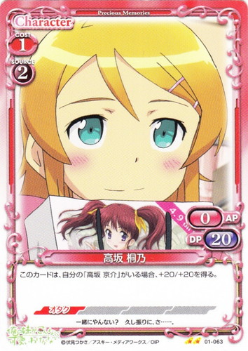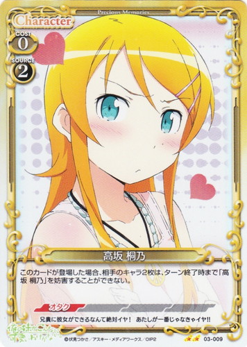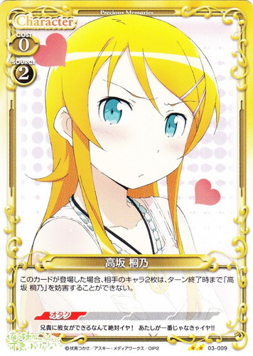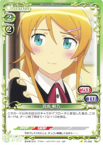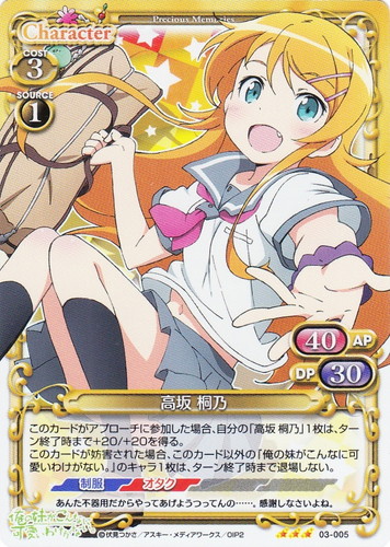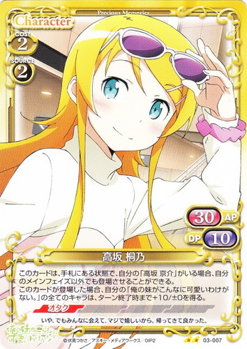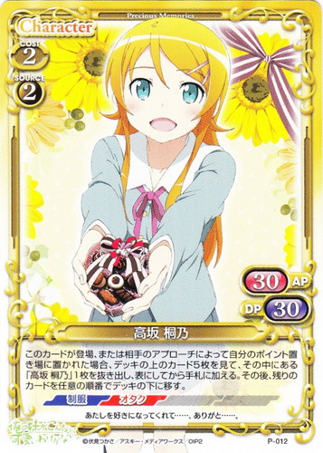 ![]() ![]() | P-012 高坂 桐乃 Character 俺の妹がこんなに可愛いわけがない プロモーションカード 色:黄 特徴:制服/オタク 使用コスト:2 発生コスト:2 AP:30 DP:30 このカードが登場、または相手のアプローチによって衣自分のポイント置き場に置かれた場合、デッキの上のカード5枚を見て、その中にある「高坂 桐乃」1枚を抜き出し、表にしてから手札に加える。その後、残りのカードを任意の順番でデッキの下に移す。 あたしを好きになってくれて・・・・・・、ありがと・・・・・・。 作品名:俺の妹がこんなに可愛いわけがない。 |
