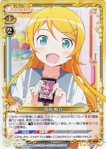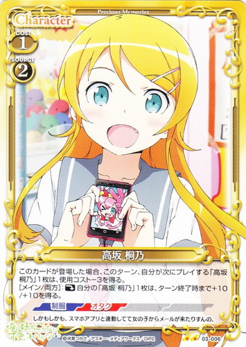![]() ![]() | 03-006 高坂 桐乃 Character 俺の妹がこんなに可愛いわけがない。スペシャルパックPart.2 U(foil) 色:黄 特徴:制服/オタク 使用コスト:1 発生コスト:2 このカードが登場した場合、このターン、自分が次にプレイする「高坂 桐乃」1枚は、使用コスト-3を得る。 [メイン/両方]:[休息]自分の「高坂 桐乃」1枚は、ターン終了時まで+10/+10を得る。 しかもしかも、スマホアプリと連動して女の子からメールが来たりすんの。 作品名:俺の妹がこんなに可愛いわけがない。 |