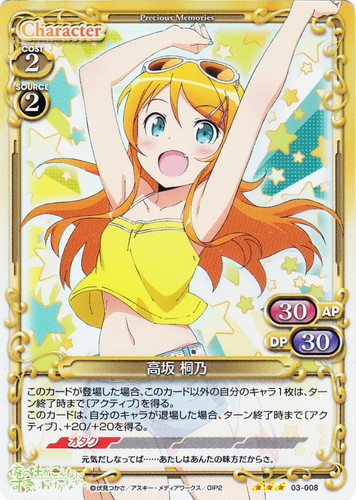 ![]() ![]() | 03-008 高坂 桐乃 Character 俺の妹がこんなに可愛いわけがない。スペシャルパックPart.2 R 色:黄 特徴:オタク 使用コスト:2 発生コスト:2 AP:30 DP:30 このカードが登場した場合、このカード以外の自分のキャラ1枚は、ターン終了時まで〔アクティブ〕を得る。 このカードは、自分のキャラが退場した場合、ターン終了時まで〔アクティブ〕、+20/+20を得る。 元気だしなってば・・・・・・あたしはあんたの味方だからさ。 作品名:俺の妹がこんなに可愛いわけがない。 |