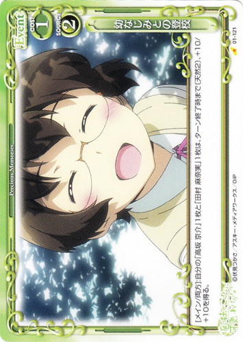 ![]() ![]() | 01-121 幼なじみとの登校 Event 俺の妹がこんなに可愛いわけがない ブースターパック C 色:緑 使用コスト:1 発生コスト:2 [メイン/両方]:自分の「高坂 京介」1枚と「田村 麻奈実」1枚は、ターン終了時まで〔天然2〕、+10/+10を得る。 作品名:俺の妹がこんなに可愛いわけがない |
