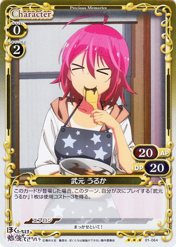 このカードが登場した場合、このターン、自分が次にプレイする「武元 うるか」1枚は使用コスト-3を得る。