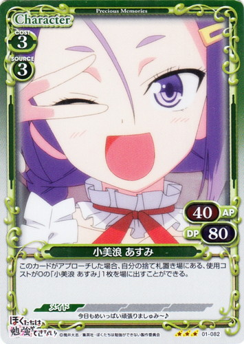 このカードがアプローチした場合、自分の捨て札置き場にある、使用コストが0の「小美浪 あすみ」1枚を場に出すことができる。