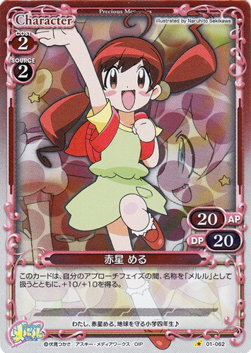 ![]() ![]() | 01-062 赤星 める Character 俺の妹がこんなに可愛いわけがない ブースターパック C 色:赤 使用コスト:2 発生コスト:2 AP:20 DP:20 このカードは、自分のアプローチフェイズの間、名称を「メルル」として扱うとともに、+10/+10を得る。 わたし、赤星める。地球を守る小学四年生♪ illust:Naruhito Sekikawa 作品名:星くず☆うぃっちメルル |