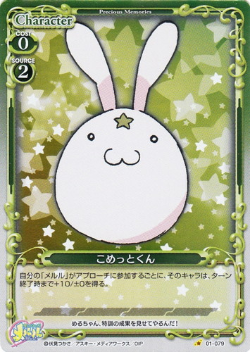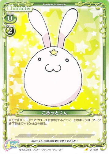 ![]() ![]() | 01-079 こめっとくん Character 俺の妹がこんなに可愛いわけがない ブースターパック C(foil) 色:緑 使用コスト:0 発生コスト:2 自分の「メルル」がアプローチに参加するごとに、そのキャラは、ターン終了時まで+10/±0を得る。 めるちゃん、特訓の成果を見せてやるんだ! 作品名:星くず☆うぃっちメルル |