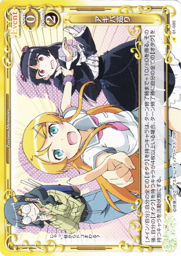 ![]() ![]() | 03-023 高坂 桐乃&新垣 あやせ Character 俺の妹がこんなに可愛いわけがない。スペシャルパックPart.2 R 色:青 特徴:オタク 使用コスト:4 発生コスト:1 AP:40 DP:40 〔コンビ〕 このカードがアプローチでポイントを与えた場合、カード1枚を引く。 自分の「高坂 桐乃」が登場した場合、自分の「新垣 あやせ」1枚を活動状態にすることができる。 学校での桐乃は、とても優しく全校生徒から尊敬されている女神なんです。 作品名:俺の妹がこんなに可愛いわけがない。 |