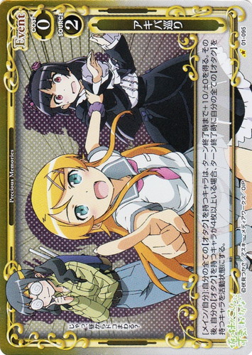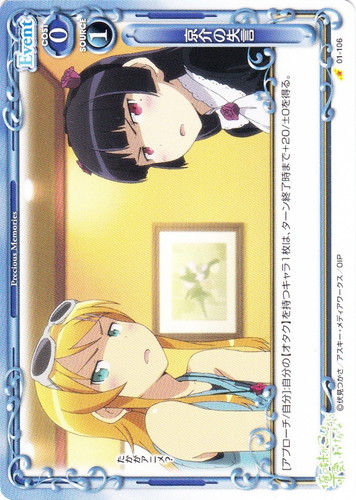 ![]() ![]() | 03-034 オタクなお泊まり会 Event 俺の妹がこんなに可愛いわけがない。スペシャルパックPart.2 U(foil) 色:青 使用コスト:0 発生コスト:2 [アプローチ/自分]:アプローチに参加していない自分の【オタク】を持つキャラ1枚を活動状態にする。その場合、自分のポイント置き場にあるカードを2枚まで表向きにする。 作品名:俺の妹がこんなに可愛いわけがない。 |