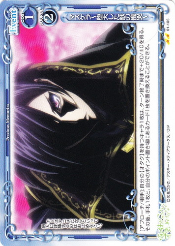 ![]() ![]() | 01-025 黒猫 Character 俺の妹がこんなに可愛いわけがない ブースターパック R 色:青 特徴:コスプレ/オタク 使用コスト:3 発生コスト:2 AP:10 DP:40 このカードが妨害された場合、カードを1枚引く。 勘違いしないで頂戴。私はただの興味本位よ。 作品名:俺の妹がこんなに可愛いわけがない |